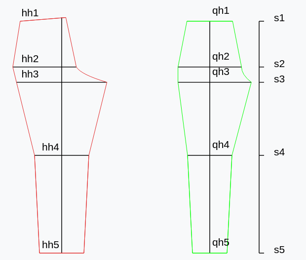 Here is the paints pattern calculator and drawing web application, input the value of the body, select the pants type, click the button above to show the patterns separately or overlapped :